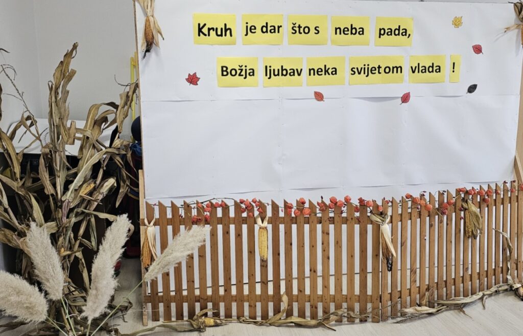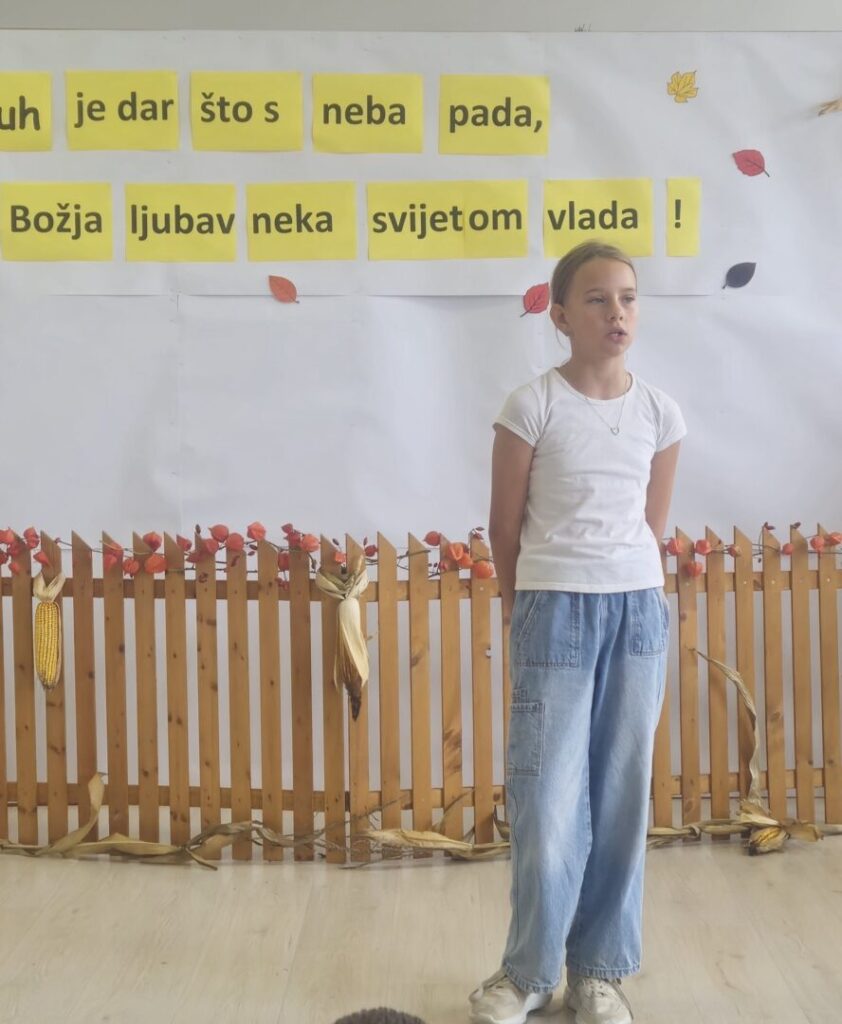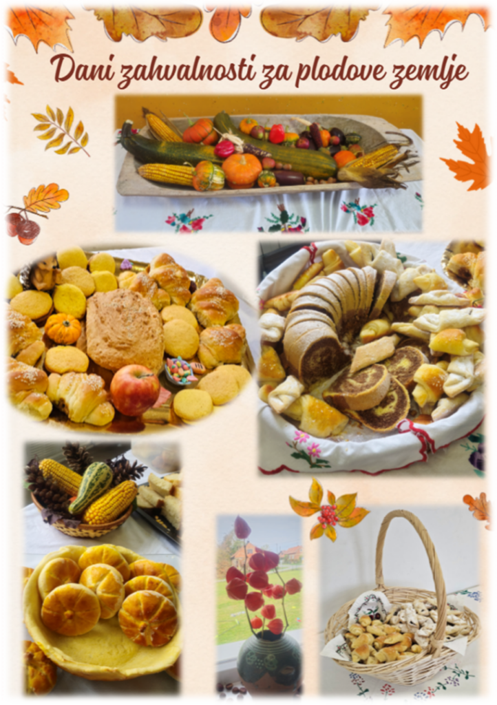 Školsko dvorište začas se ispunilo mirisima kestena koje svake godine peče naš domar Vilko, a učionicama se širio miris domaćih kolača, kruha, peciva. Na prigodno uređenim stolovima našli su se raznovrsni plodovi zemlje podsjećajući sve prisutne na važnost zahvalnosti za darove prirode.