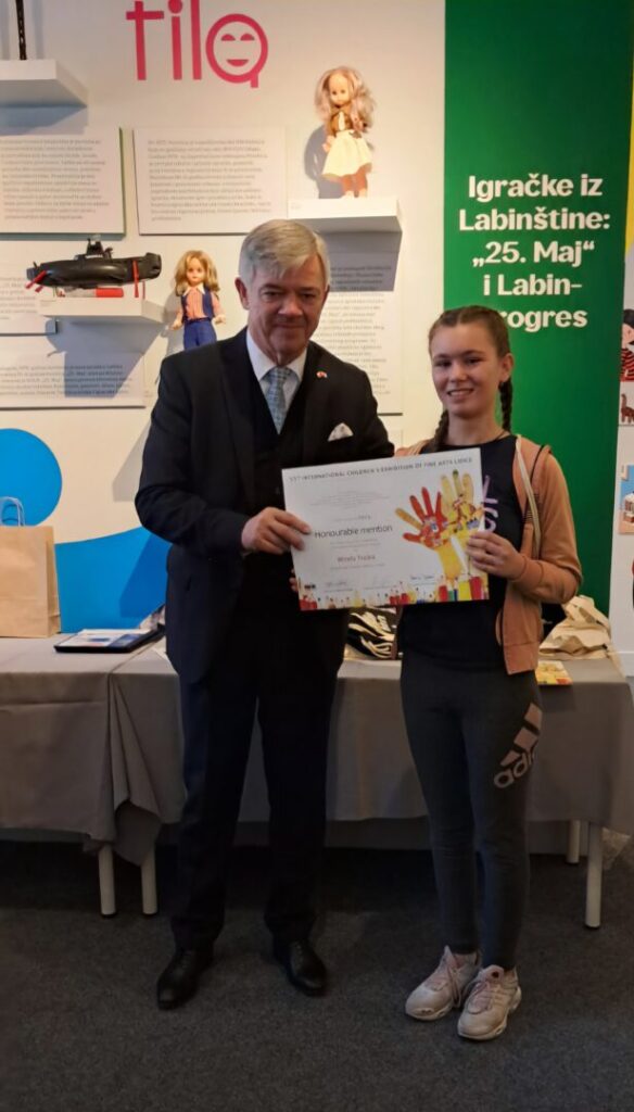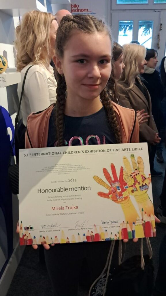 U petak, 12. prosinca, u galeriji Školskog muzeja „Školica za 5“ u Zagrebu, na svečanoj dodjeli uručena je diploma Mireli Trojka za likovni rad na temu “Igra”. Ovim likovnim radom Mirela je sudjelovala na 53. izdanju Međunarodne dječje izložbe likovnih radova Lidice 2025. Na svečanoj dodjeli autorima nagrađenih radova na Kanagawa Biennale (Japan) i Međunarodnoj izložbi Lidice (Češka) diplome su uručili Njegova Ekselencija g. Wada Mitsuhiro (Japan) i Njegova Ekselencija g. Milan Hovorka (Češka), ističući važnost međunarodne suradnje i podrške dječjem stvaralaštvu . Okupljene je u ime ravnateljice pozdravio zamjenik ravnateljice, Filip Sunđi.